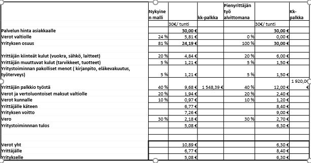 Minusta tällaisten yrittäjien työn/aikaansaaman liikevaihdon alv voisi olla 0%. Omaa työpanostaan myyvä yritys ei voi koskaan määrättömästi kasvaa, koska kuukauden tunnit ovat rajalliset, jolloin verotuksen pitäisi erota suurten yritysten verotuksesta merkittävästi. Yrittäjälle itselleen maksetusta palkasta ja mahdollisesta voitosta maksetaan verot. Hinta kuluttajalle pysyisi samana, mutta alvin osuus jäisi yrityksen käyttöön. Aika helppo tapa ja vastaantulo valtiolta, ilman että tarvitaan sitten byrokratiaa hakea erilaisia tukia tms. nyt esimerkiksi kun korona helpottaa. Reiluuden nimissä verojen osuus ei saisi ylittää yrittäjälle jäävää osuutta koskaan.