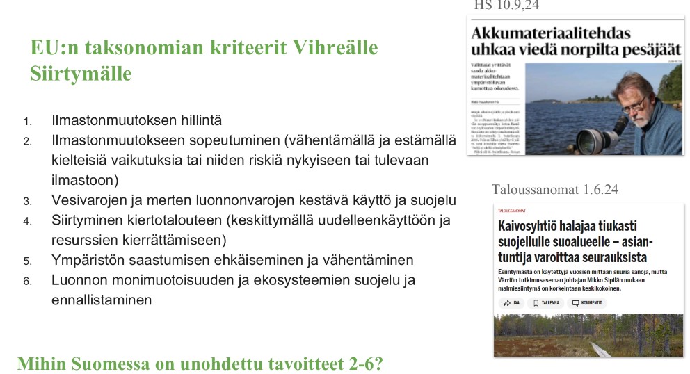 Tällä hetkellä kansalaisvaikuttaminen valittamalla on ainoa keino suitsia luonnon turmelemista teollisuushankkeissa. Siksi hankkeet viivästyvät. Lainsäädännössämme ei ole päästörajoja kaivos- tai akkuteollisuudelle. Tuskin kukaan valittaa jos lainsäädäntö on kunnossa.